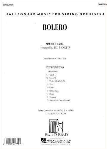 [...] which would make you think you're getting the original full score of Ravel's Bolero, what you will get is an adaptation for student orchestra (strings, piano and 2 percussion) as arranged in 2003 by Ted Ricketts. As an indication of what to expect from this score, the cover page lists a suggested performance time of 5'10", which--as Bolero lovers know--is far short of the original 13'-16' playing time. This is stapled sheet music without cardboard covers and is of value only to the conductor of a student peformance. Additionally, I had ordered this from .com on May 21 and it was delivered on August 2.