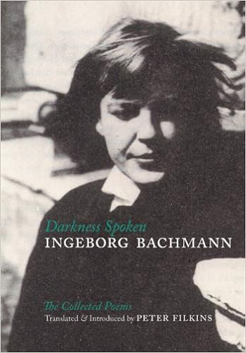 Darkness Spoken: The Collected Poems of Ingeborg BachmannThe hauntingly beautiful poems in this volume give expression to a deep and often brooding poetic consciousness which is one and the same as language. Set free--the word is not casually chosen--language reconfigures itself in an act of renewal, achieving a new vitality. Thus, ultimately, no matter how somber they may be, in their very existence, the poems strike a note of historic victory over all of those forces of darkenss that surround the poet."Libraries," a poem from 1945 - 1956, is revealing of the quality and historic importance of the poems:"The shelves sag./The volumes are weighted down with the past./ Their sweat is dust./ The impulse is rigidity./ They no longer sturggle./ They have saved themselves/upon the island of knowledge./Soometimes they've lost their conscience./Here and there, protruding/from them, human fingers/point directly towards life/or twards heaven.Clearly, language is mired in the past, is petrified, no longer engaged in any vitality-giving struggle, and no longer engaged in acts of conscience. The final four lines are mysterious; but one possibility is that even within this stagnant heap of language, encouraging human signs are to be found. These, surely, are the inspiration for Ingeborg Bachmann's poetry, here collected.This reviewer is in no position to comapare Filkins' translations with the original German texts that accompany them. In their own right, at the very least, they are pleasant enough.