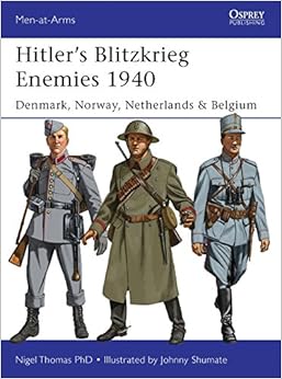 In the spring of 1940, the lightly armed European states of Denmark, Norway, Luxembourg, Netherlands, and Belgium fell within hours to weeks to Nazi invasion. The Norwegian Army resisted longest, thanks in part to Norway's distance from Germany and to intervention by British and French troops. The struggles of these small states were soon forgotten in the much larger and more horrific fighting to come."Hitler's Blitzkrieg Enemies 1940" is an Osprey Men-at-Arms Series book, authored Nigel Thomas, with illustrations by Johnny Shumate. It attempts to shed a little light on the militaries of the four countries that fell in spring 1940. The text proceeds by nation, with concise descriptions of its military, its brief battle against the Nazis, and especially, their uniforms and equipment. The narrative is much enhanced by a goodly collection of wartime photographs, illustrations, and maps. A collection of color plates at the back of the book provides nice renderings of some typical uniforms.This is a short book, less than fifty pages, with a good presentation on uniforms. It offers some interesting details about the respective armies, nearly all of whom found reason to mount some portion of their forces on bicycles and motorcycles, in addition to horses and light armored vehicles. Recommended to students of the Second World War, especially those interested in uniforms and equipment.